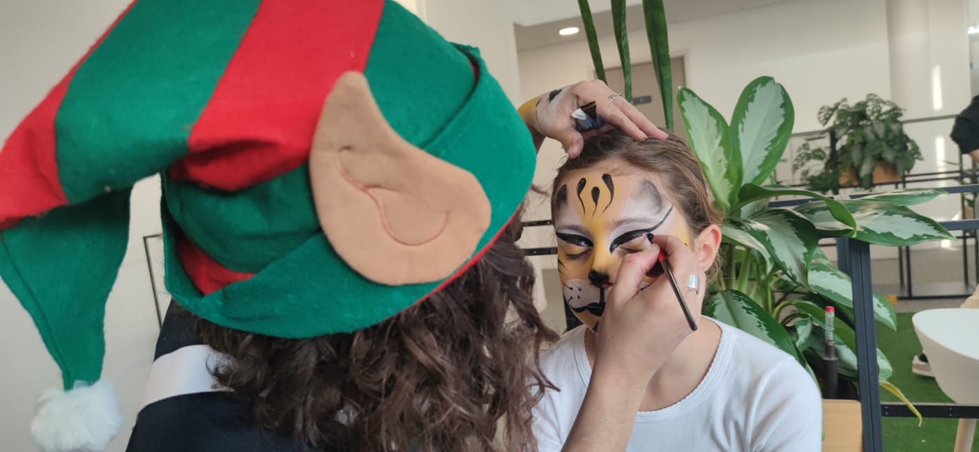 Notre animation maquillage enfants en tenue de Noël grime vos petits invités. L'artiste jeune public incontournable de votre Arbre de Noël.