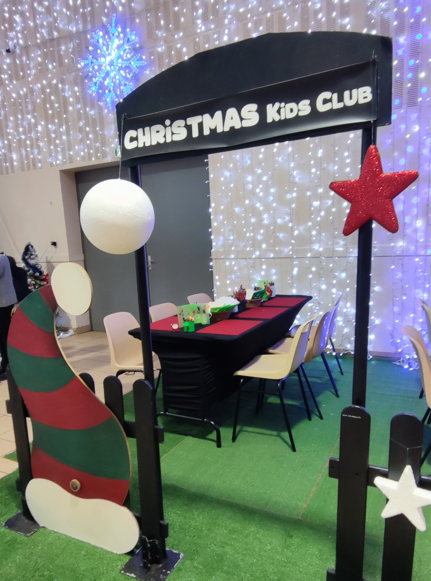 • 1 Stand d’animation avec deux barrières noires décorées et une arche avec la signalétique « Christmas Kids Club ».