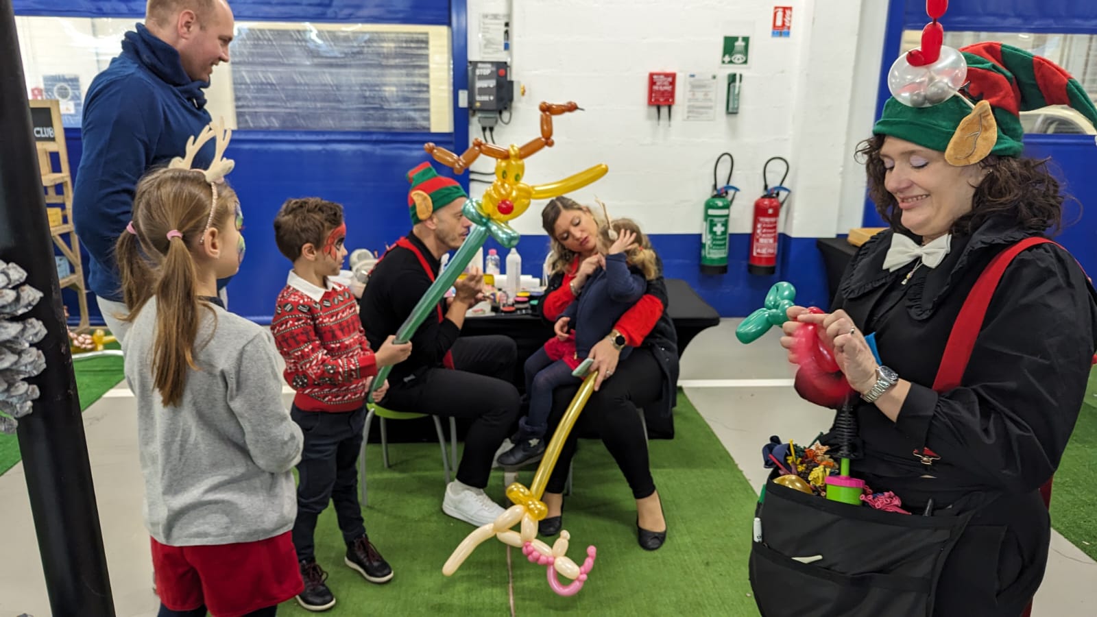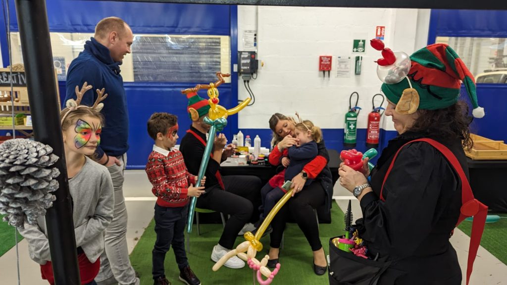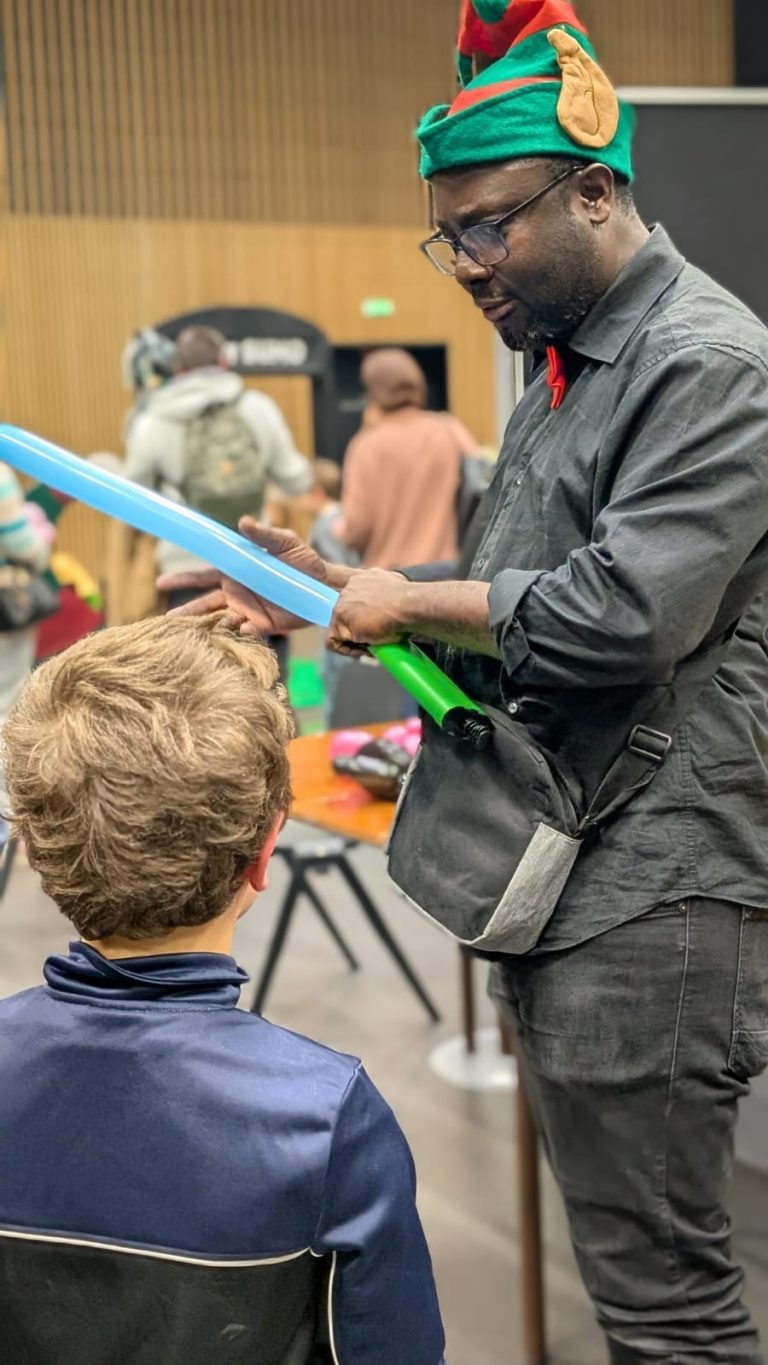 Lutine sculptrice de ballons en exercice au cours d’une animation arbre de noël d’entreprise pour les enfants du peronnel en 2024.