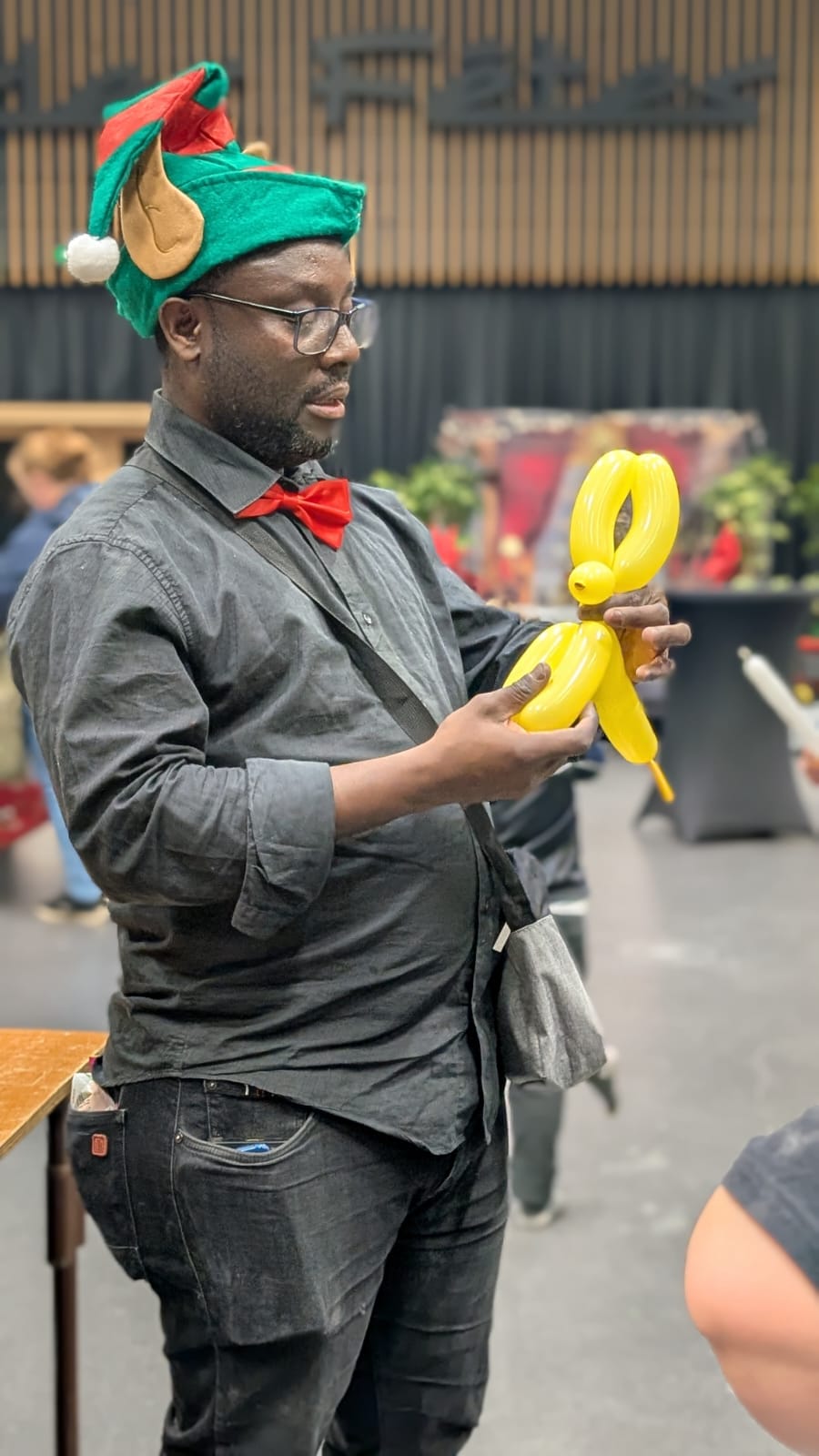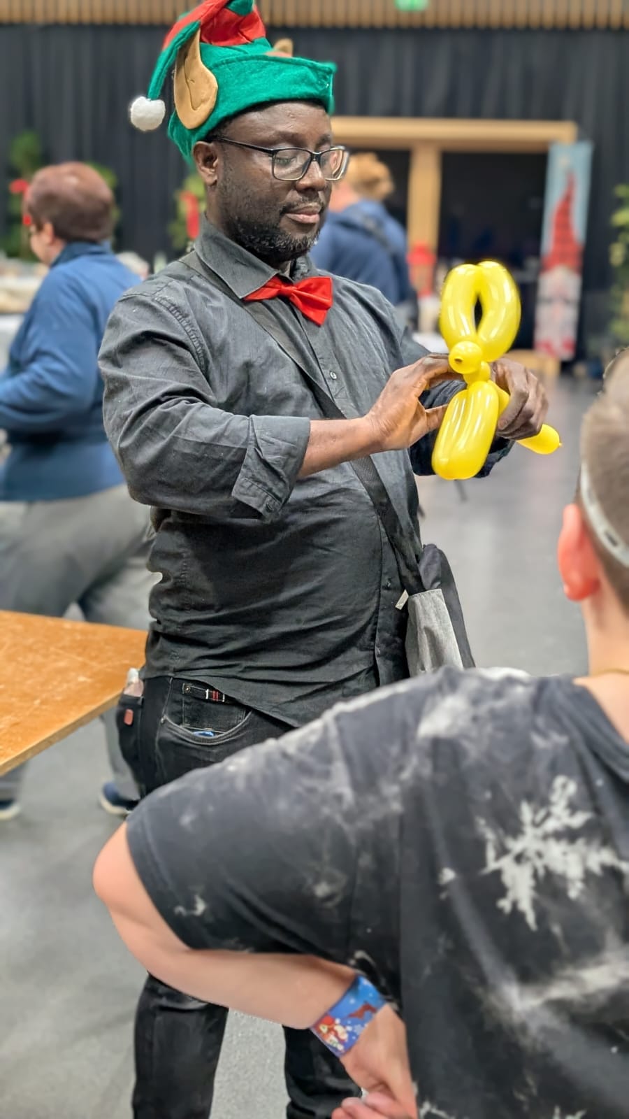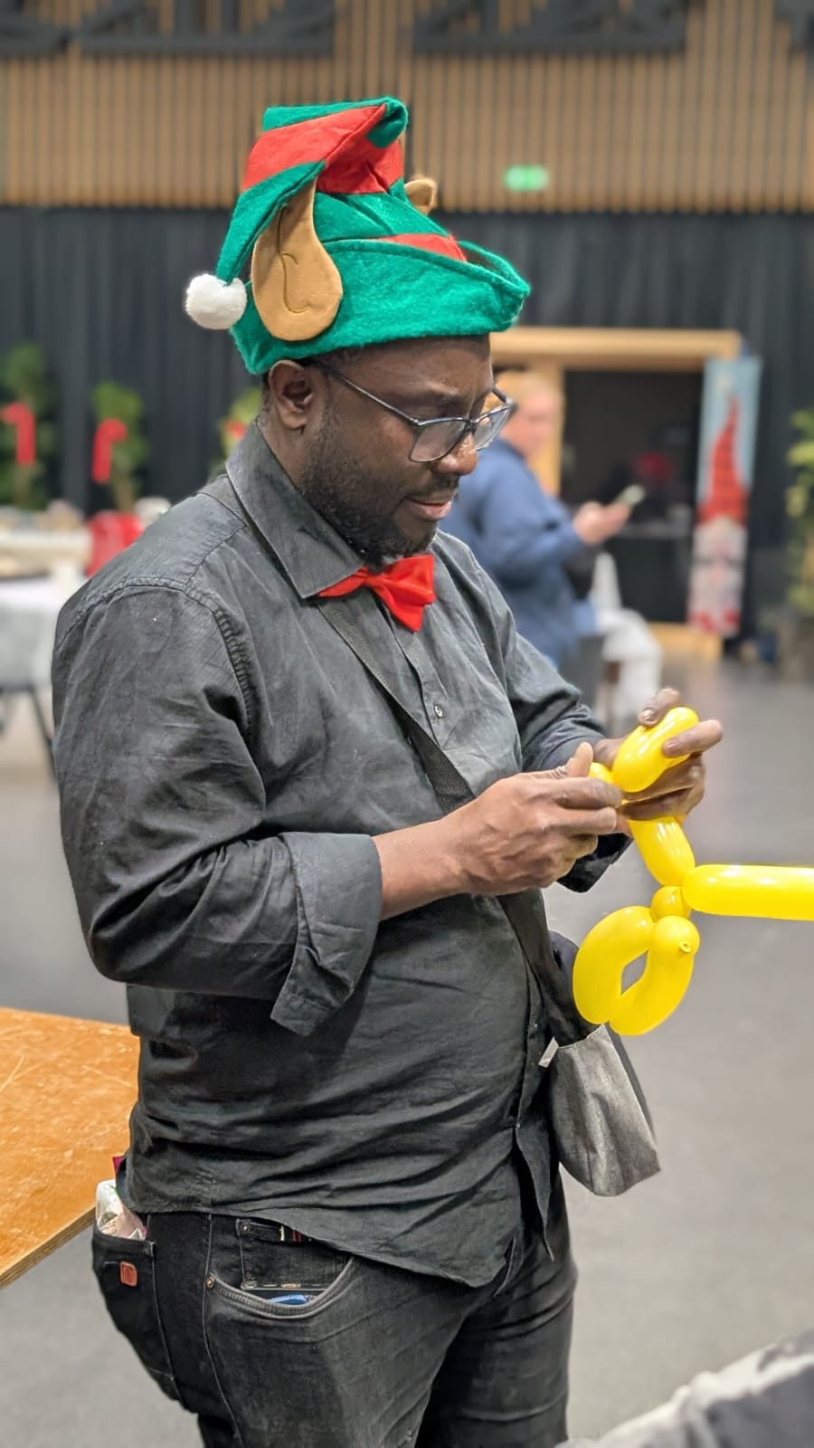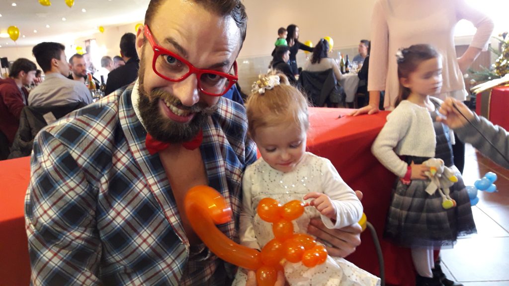Jean Jacques, lutin sculpteur de ballons dans l’exercice de ses fonctions pour l’animation d’un noël d’entreprise comptant presque 200 enfants.