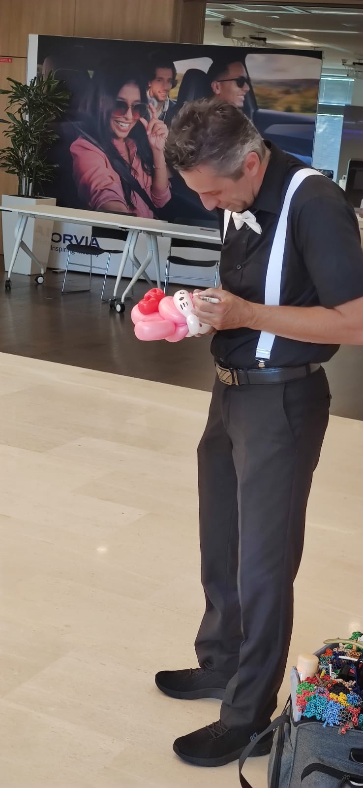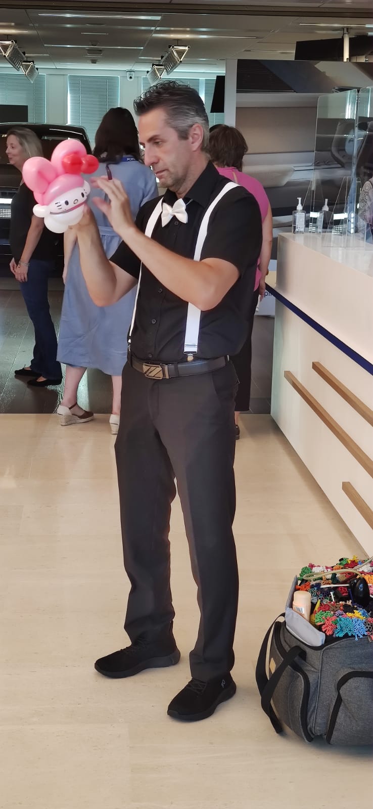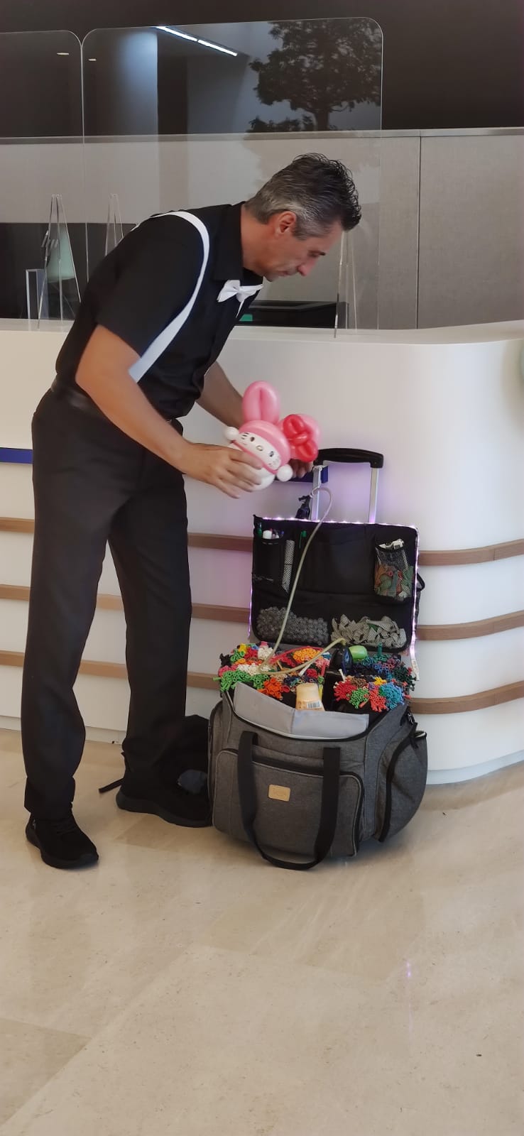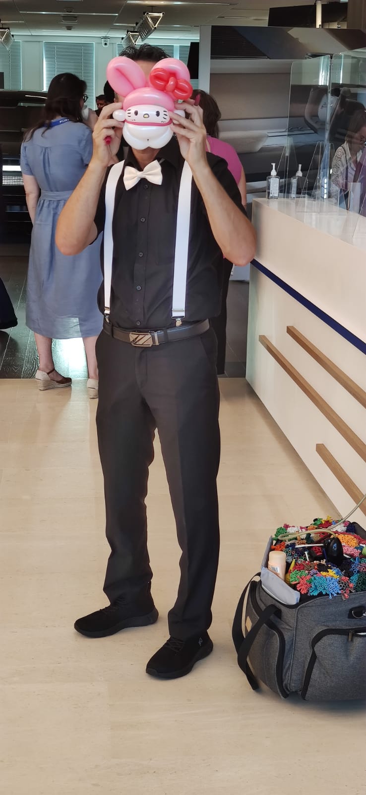 Jean Jacques, lutin sculpteur de ballons dans l’exercice de ses fonctions pour l’animation d’un noël d’entreprise comptant presque 200 enfants.